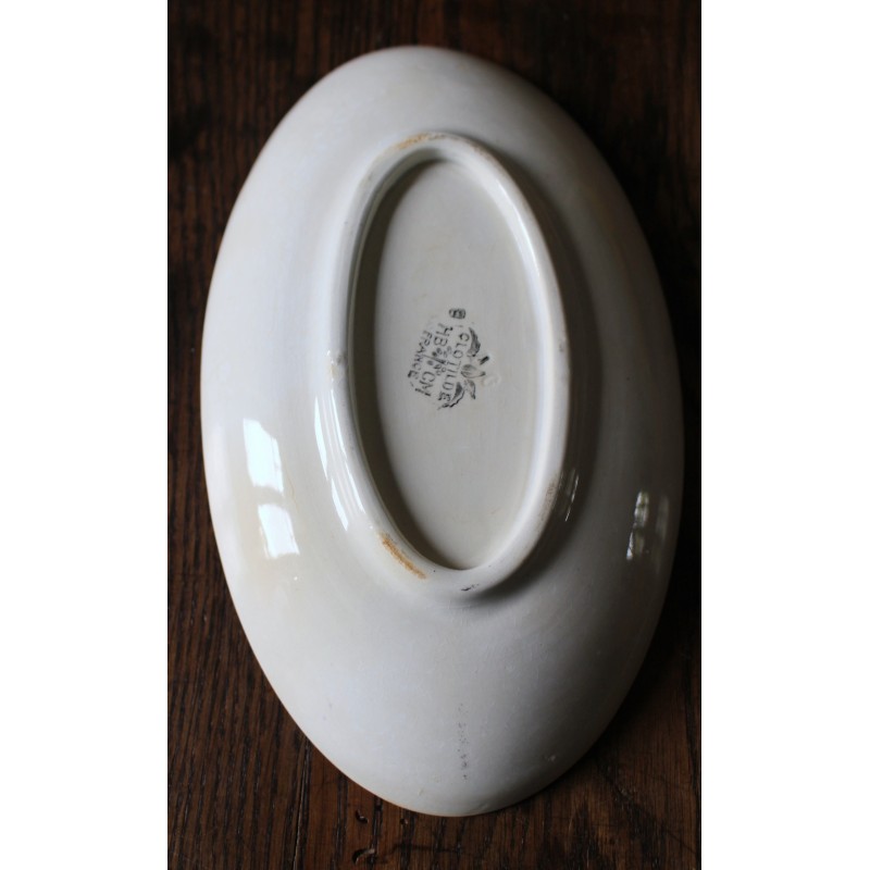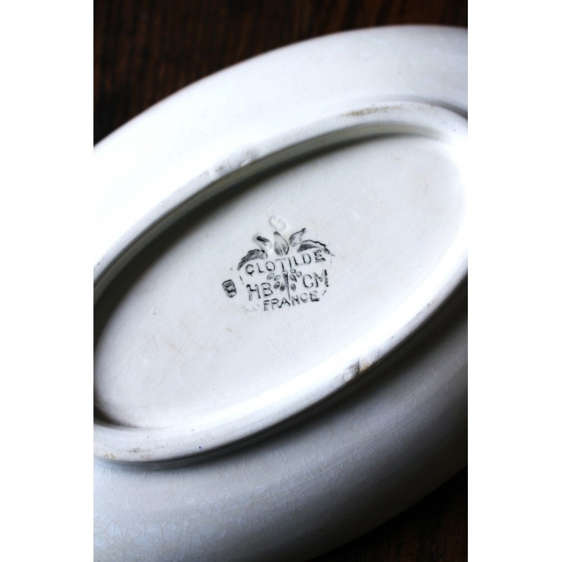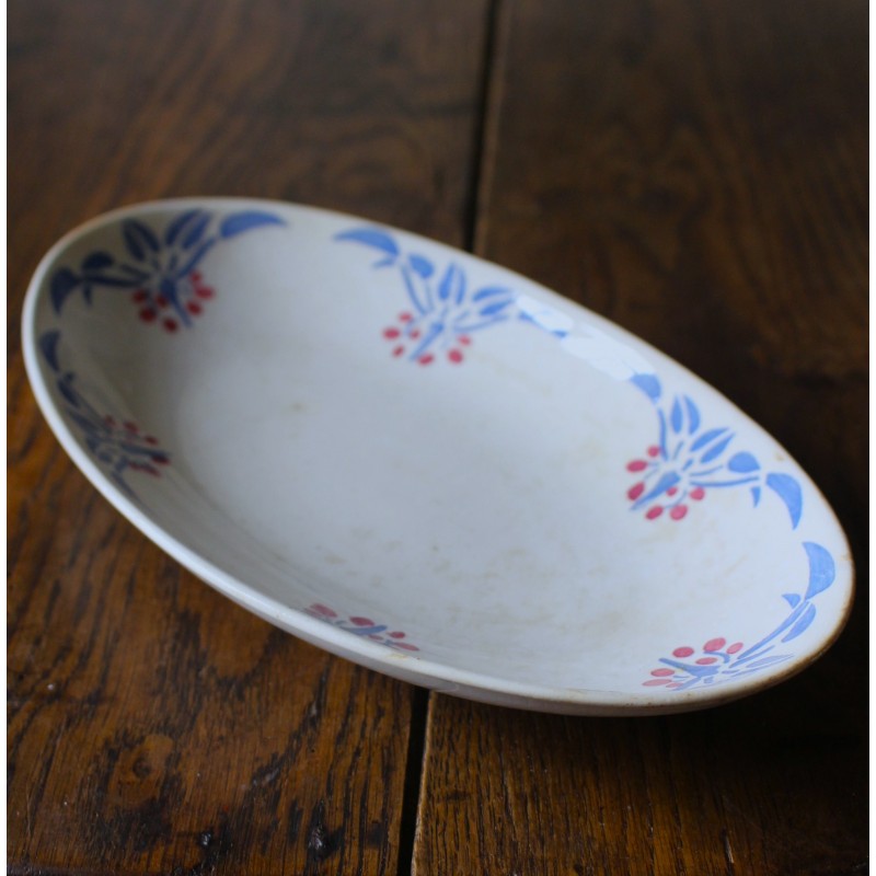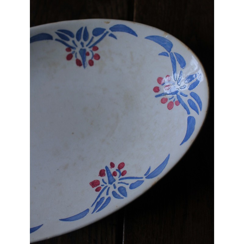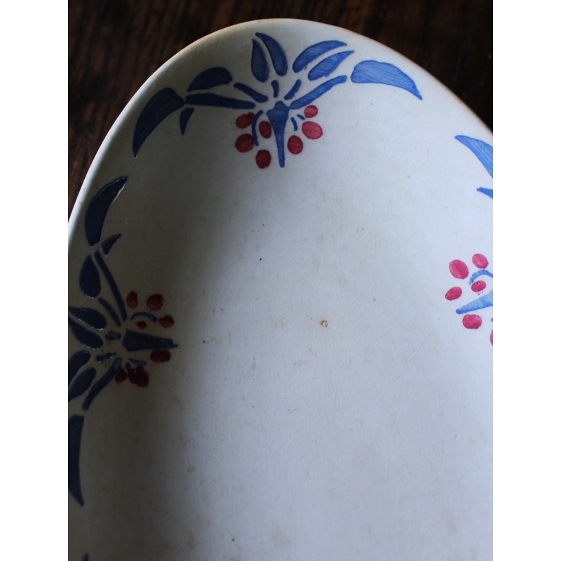 Ravier Rouge Bleu Belle pièce ancienne Art Deco Collection Clotilde HBCM (Creil & Montereau) Blason estampille Pas de manque, pas d'éclat, beau glacis Des piqûres du temps pour charme et authenticité L 24,2 x p 14,3 x h 3,9 cm