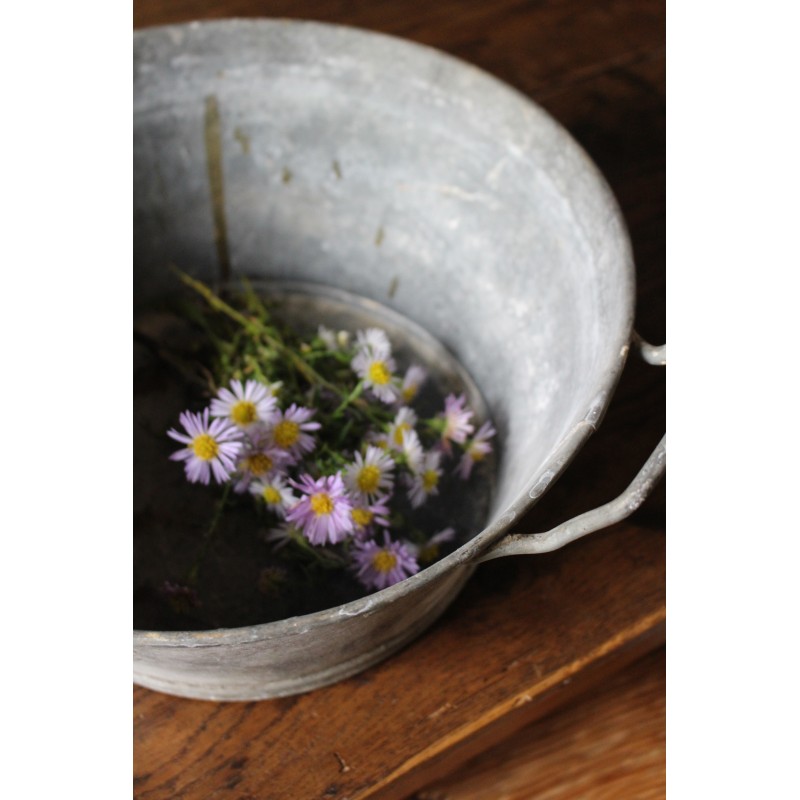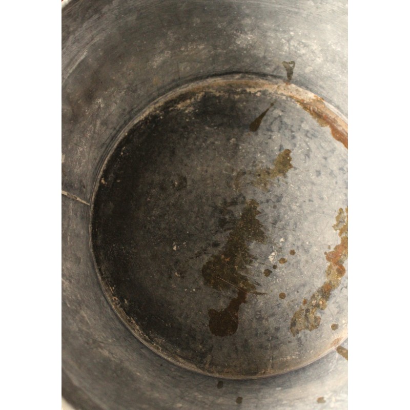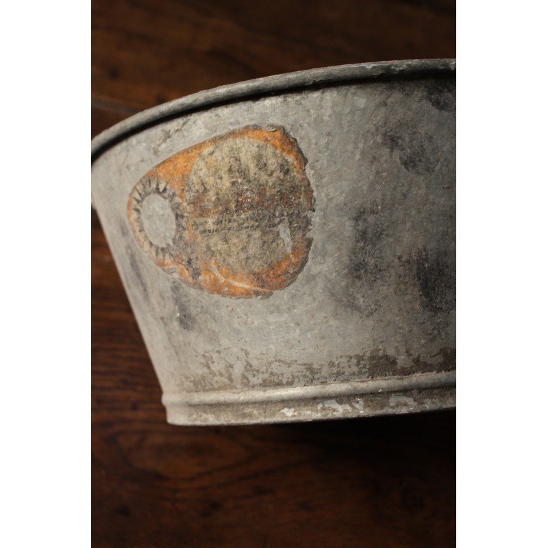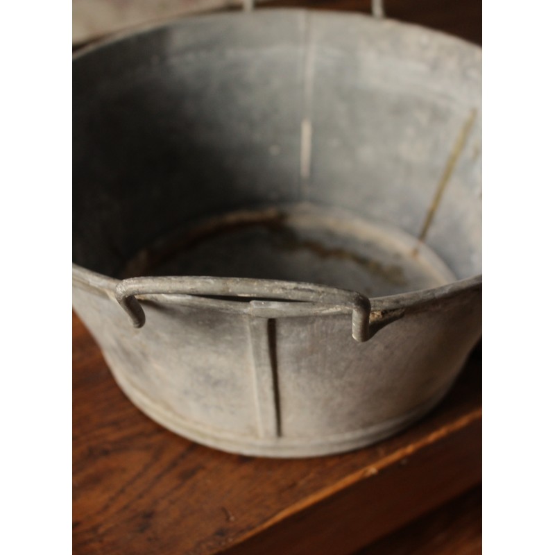 Petite bassine Zinc Ronde Deux anses Bel état général Marques du temps pour charme et authenticité h 13,7 x l 36,1 x d 31,2 cm Etanche Etiquette d'origine Jardin, lavabo, déco, selon vos envies.
