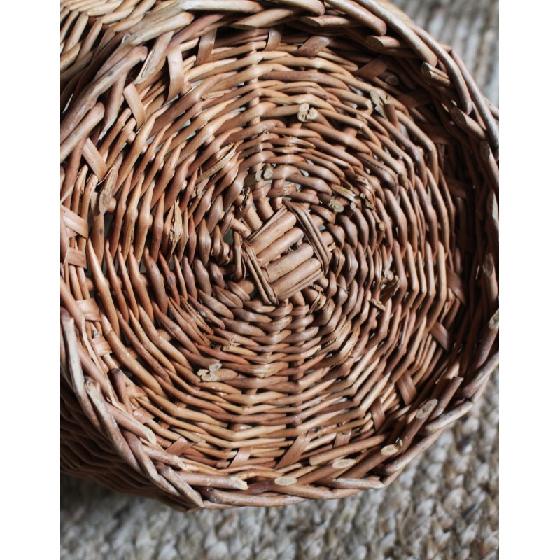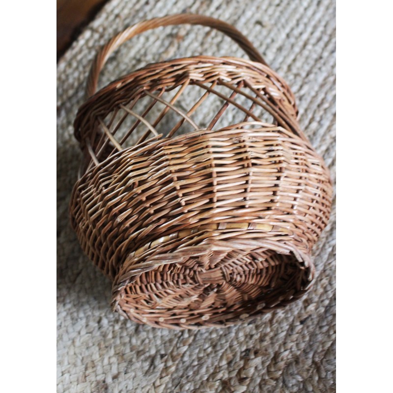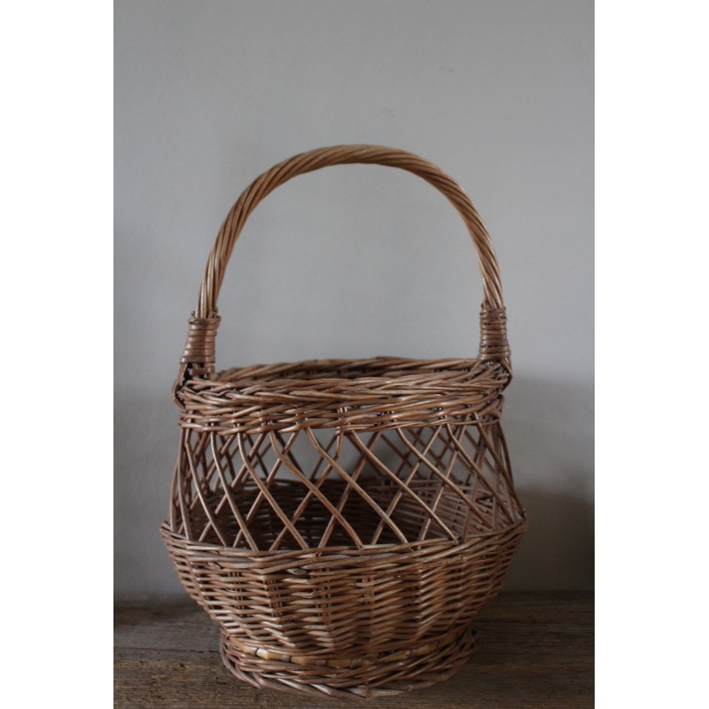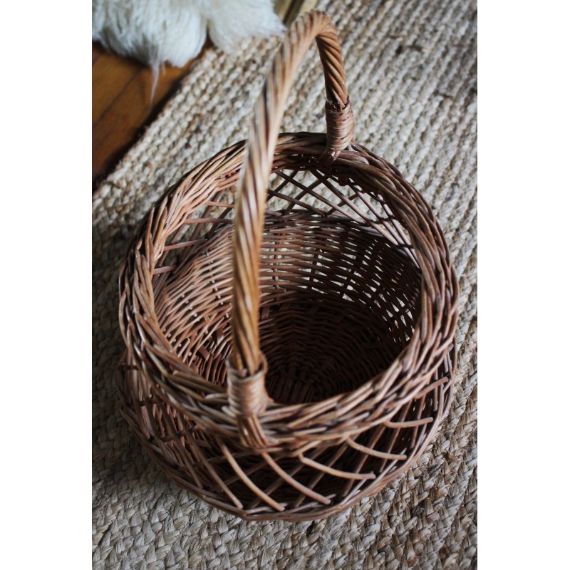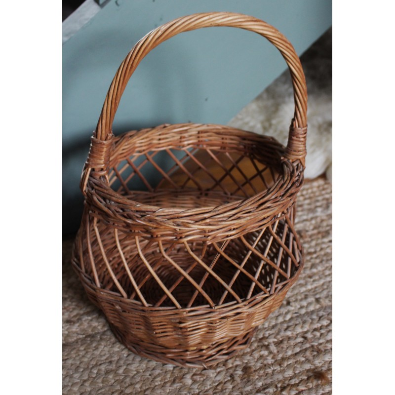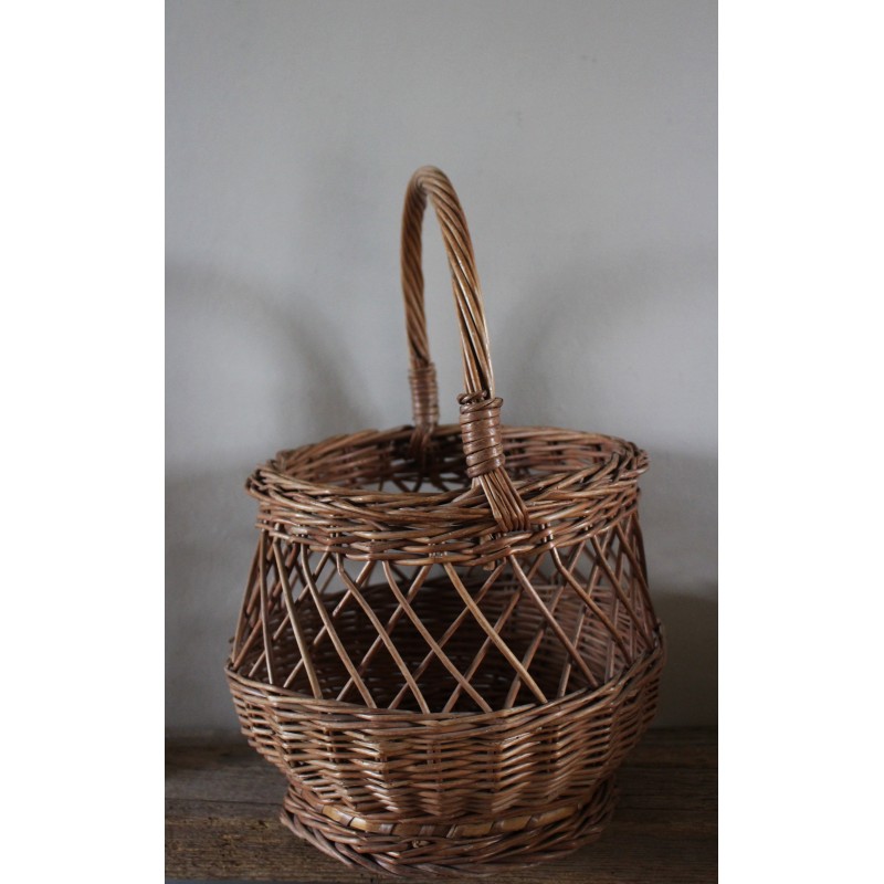 Panier Belle pièce ancienne Osier foncé Rondeur Ajouré Anse ronde tressée rigide ( 18 cm) Sur pied Quelques marques du temps pour charme et authenticité h 21 x l 28 x d 21 cm