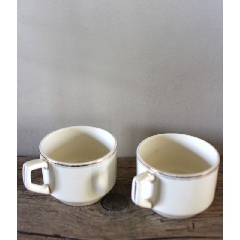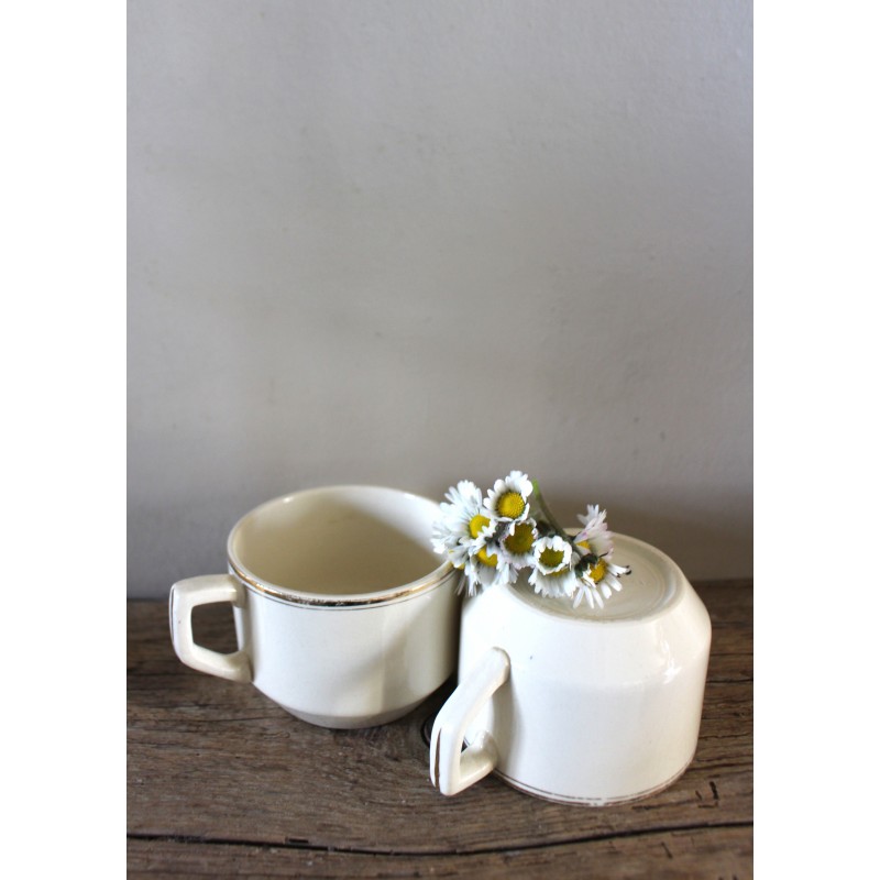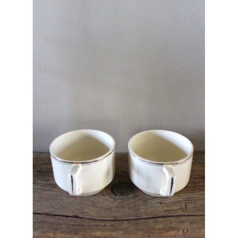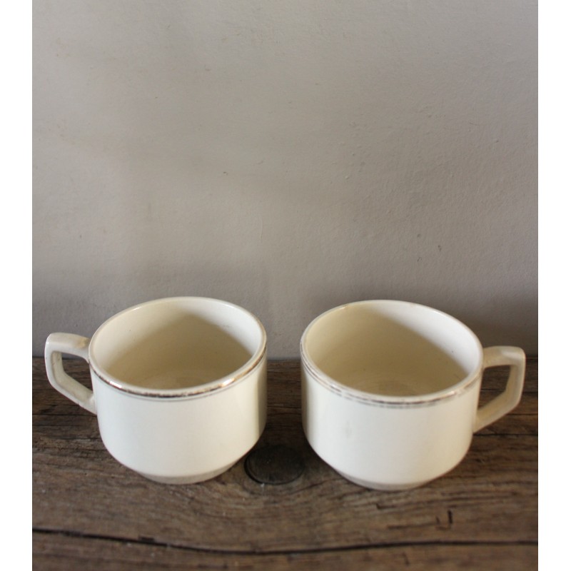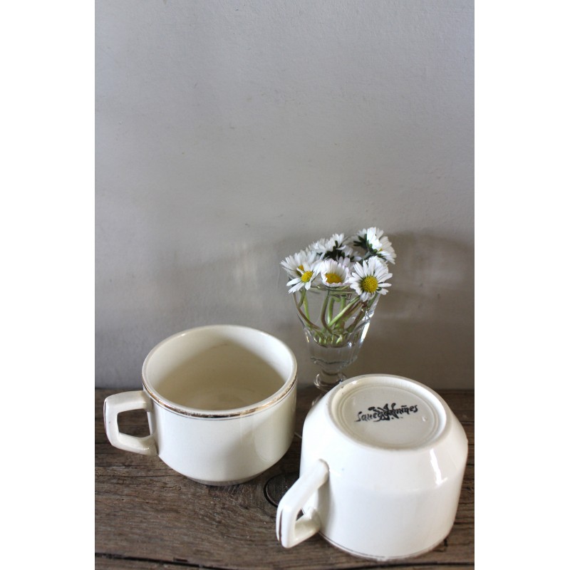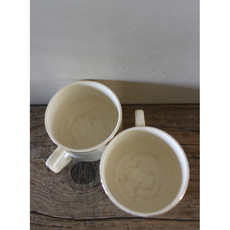 Un lot de deux tasses Thé Café Faïence écrue Ces crémeux qu'on adore Dorure (quelques manques) Sarreguemines Blasons estampilles Fin XIX ème h 5,7 x d 7,9 cm Quelques marques du temps pour charme et authenticité D'autres tasses disponibles pour créer votre propre lot.