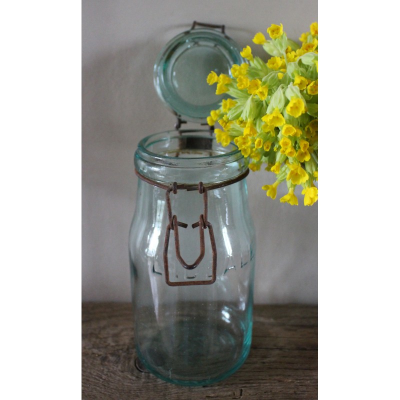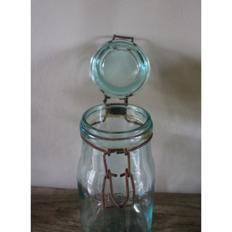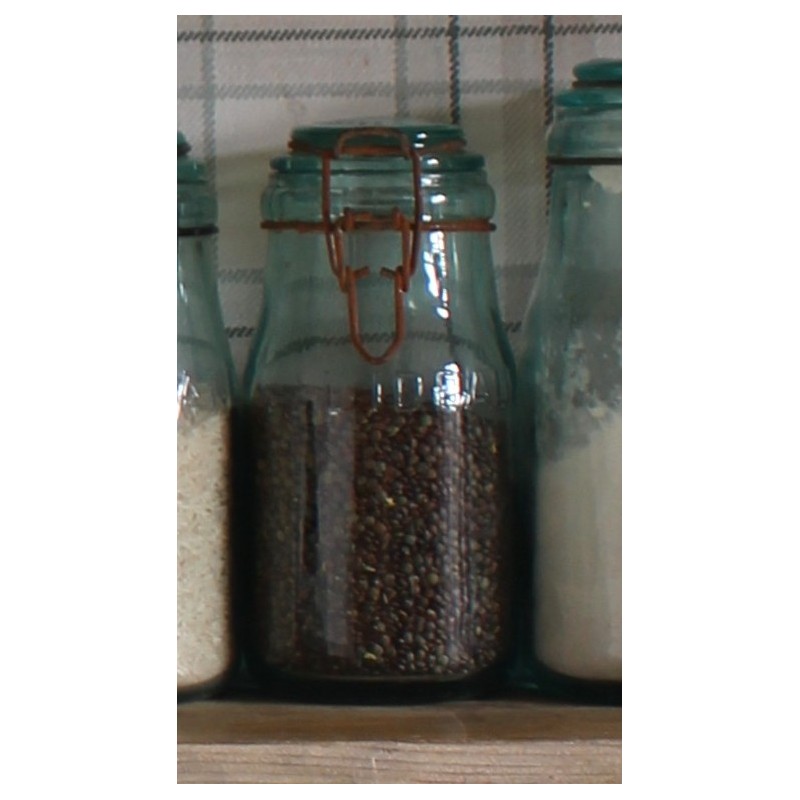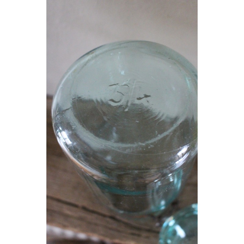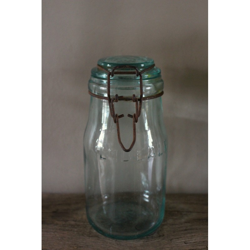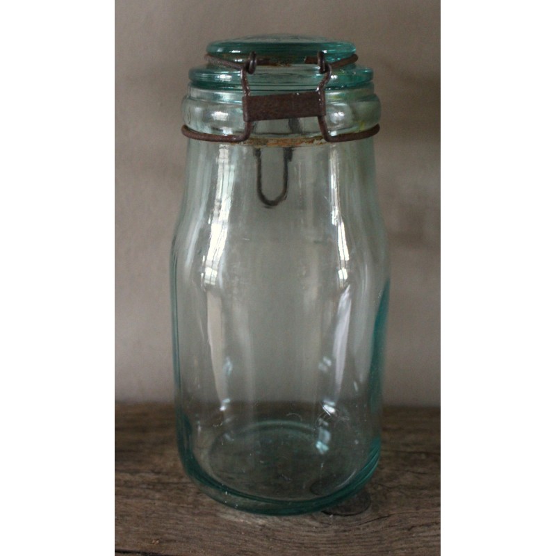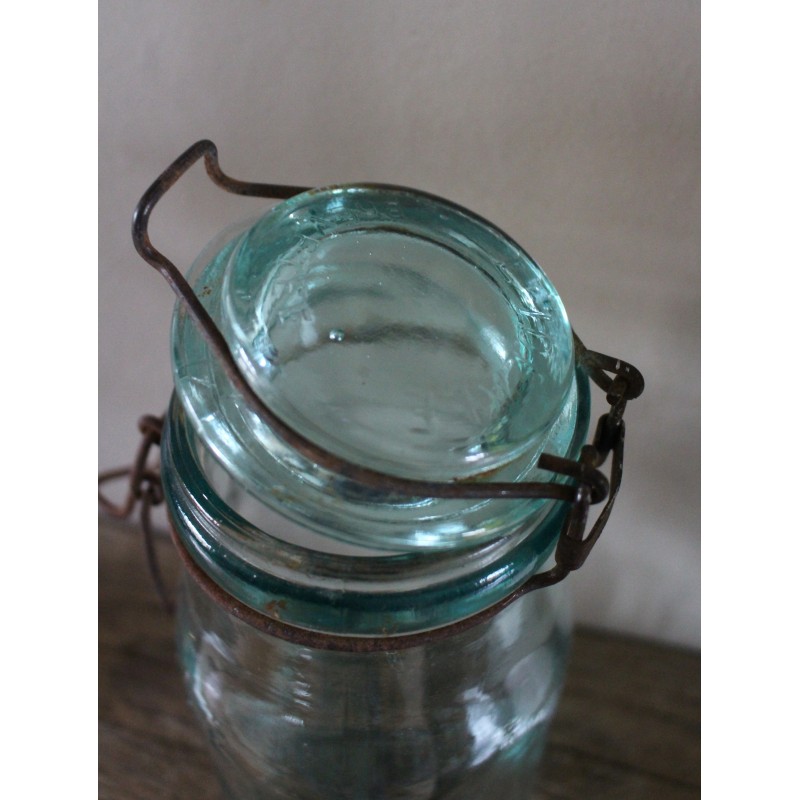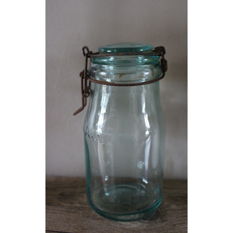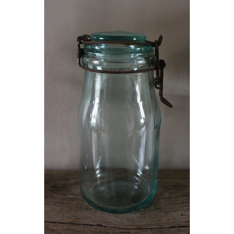 Bocal Ancien pot de conservation Collection L'Idéale Verre Vert bleu Format rare 3/4 L Fermeture métal dans son jus fonctionnelle h 20 x d 9,4 cm Vrac, vase, ustensiles, selon vos envies.