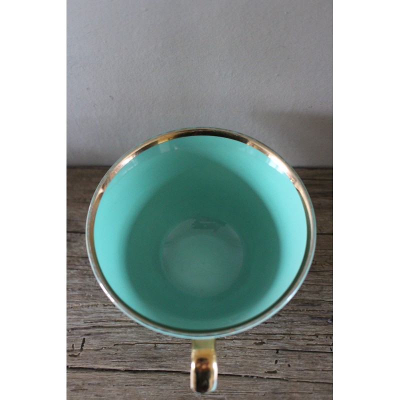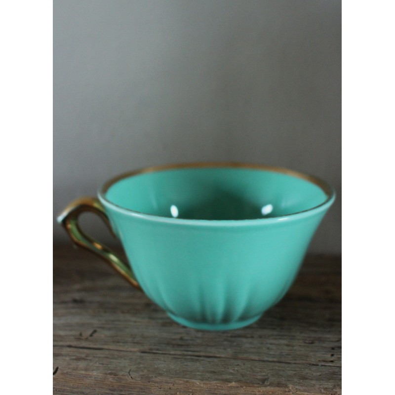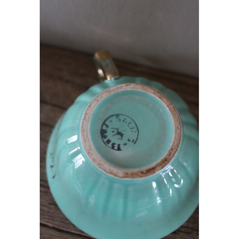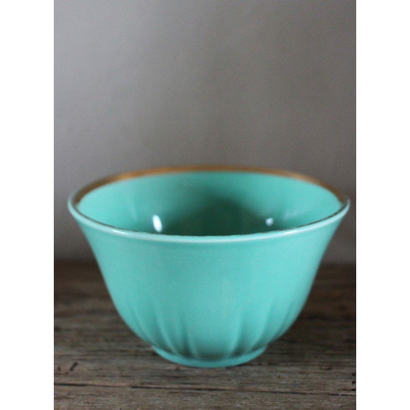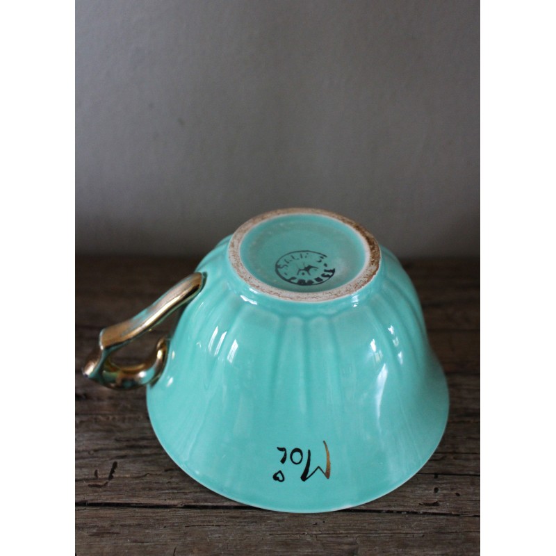 Tasse Grand format, bol Une anse Faïence Vert menthe Dorure Collection Moi Salins Blason estampille Belle pièce ancienne Quelques manques de dorure pour charme et authenticité h 6,5 x l 13,8 x d 11,1 cm
